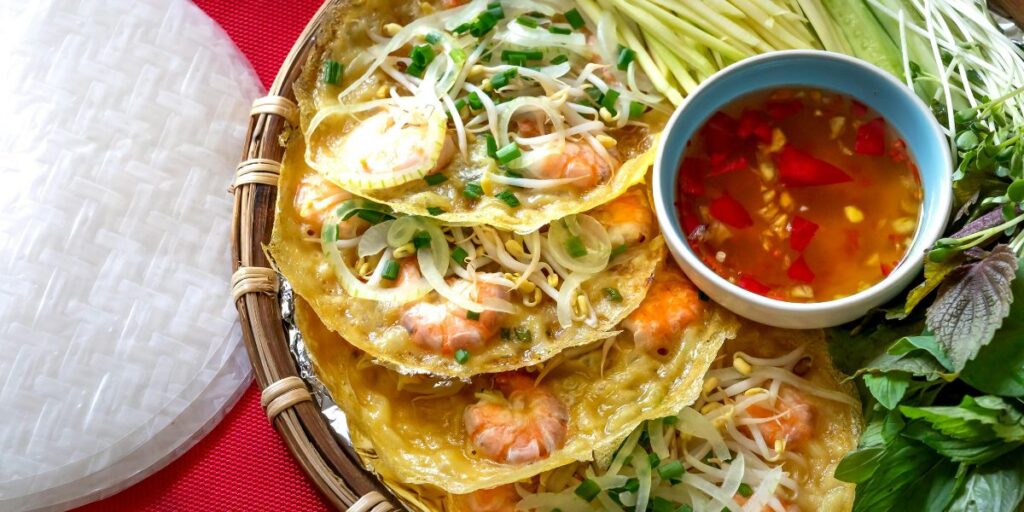 - Bánh Xèo : Une crêpe vietnamienne croustillante, garnie de porc, de crevettes et de germes de soja, servie avec des herbes fraîches et une sauce de poisson.